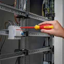 - ไขควง VDE จาก Bosch Professional มาพร้อมดีไซน์ป้องกันการกลิ้งเพื่อช่วยให้เครื่องมือไม่กลิ้งออกนอกพื้นที่ทำงาน นอกจากนี้ยังมีขนาดและรูปทรงที่มองเห็นได้อยากชัดเจนจากมือจับในหลายๆ ตำแหน่งด้วย