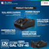 - GAL 12V-40: ชาร์จได้อย่างรวดเร็วสำหรับแบตเตอรี่ 12 โวลท์ทุกรุ่น ชาร์จแบตเตอรี่ 12 โวลท์ 2.0 Ah จากระดับ 0 ถึง 80% ได้ใน 24 นาที