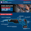 GSA 185-LI มาพร้อมเทคโนโลยี Brushless จากบ็อชที่ให้ประสิทธิภาพการตัดแบบไร้สายที่เหนือชั้นในระดับเทียบเท่าเลื่อยชักแบบมีสายขนาด 1,100 W GSA 185-LI มีอัตราส่วนน้ำหนักต่อกำลังที่ยอดเยี่ยม ช่วยให้ใช้ทำงานในทุกตำแหน่งได้ง่ายขึ้นและเหนื่อยล้าน้อยลง นอกจากนี้ยังมีฟังก์ชั่นกดล็อคโดยไม่ต้องใช้เครื่องมือที่ช่วยให้ใส่และถอดใบเลื่อยด้วยมือเดียวได้ง่าย GSA 185-LI เหมาะสำหรับงานสกัดทำลายในวัสดุหลากหลายประเภท เช่น โลหะ ไม้ พลาสติก และวัสดุฉนวน ใช้ได้กับแบตเตอรี่ระบบ Professional 18 V จากบ๊อชเลื่อยชักไร้สาย